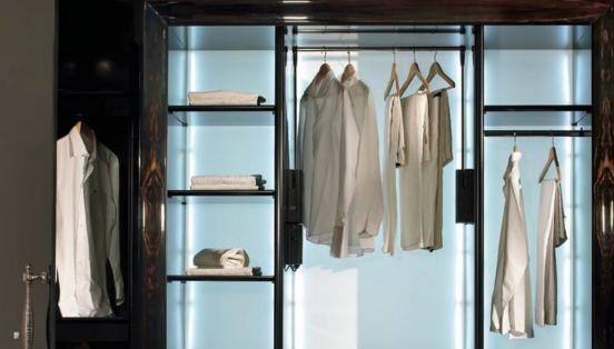 - Динамичное зонирование. Длинный гардеробный шкаф в студии: с помощью разных световых сцен можно визуально отделить зону хранения одежды от зоны с техникой или мини-баром.